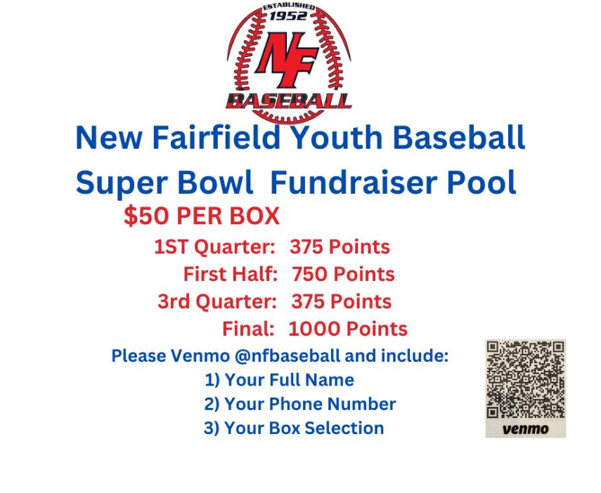 - Super Bowl Fundraiser Pool - Support New Fairfield Youth Baseball while enjoying the big game! See Details Below