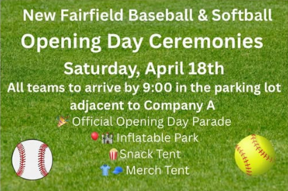 - April 18th - Opening Day Ceremony - Softball & Baseball - 9:00 AM teams arrive in the parking lot adjacent Company A Firehouse