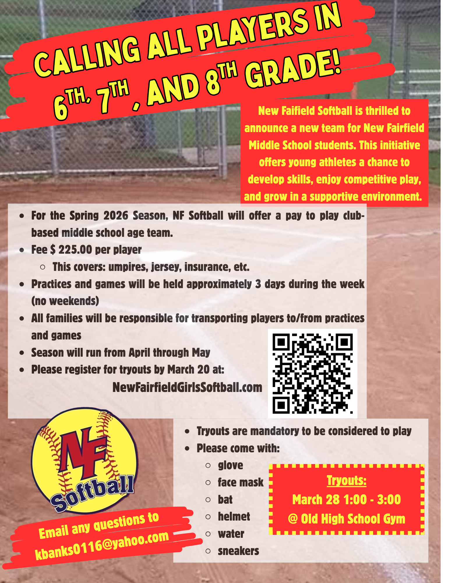 This is not in affiliation with New Fairfield Middle School or the New Fairfield Board of Education. This team is in addition to our recreational and travel program offerings. Players of this team can also participate in recreational and/or travel softball. Opponents for games will be middle school teams from surrounding towns.